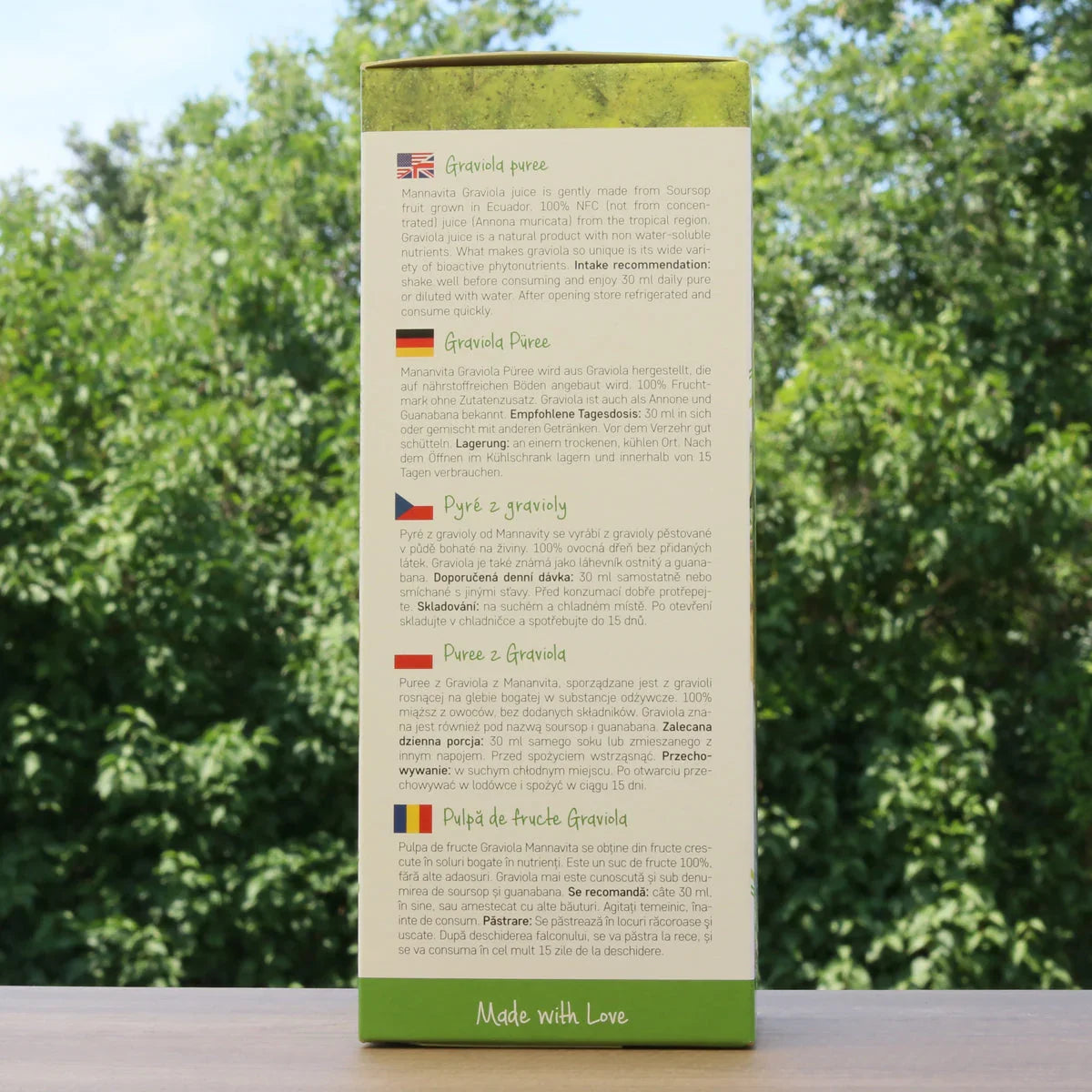 Mannavita graviola ovocná dužina je 100% ovocné pyré, tradične pripravené. Neobsahuje žiadne pridané látky ani konzervačné látky, preto by sa po otvorení mala uchovávať v chladničke a spotrebovať do 15 dní.